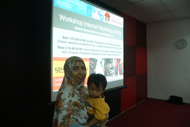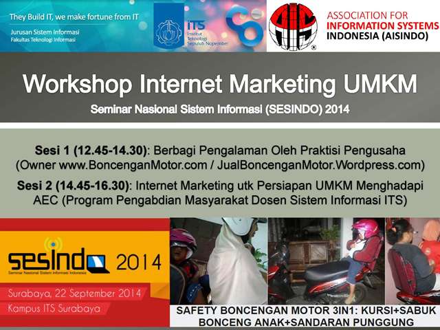 Alhamdulillah saya mendapat kehormatan diundang sebagai pembicara untuk bisa sharing ilmu dan berbagi pengalaman dengan UMKM peserta pelatihan internet marketing (sebagai persiapan umkm menghadapi AEC/MEA) dalam acara Seminar Nasional Sistem Informasi Indonesia (SESINDO) 2014 di kampus ITS Surabaya, 22 September 2014 ( http://2014.sesindo.org/ ). Semoga acara ini membawa berkah/manfaat bagi semua peserta untuk bisa memberikan inspirasi dalam mengembangkan usahanya dengan bantuan teknologi informasi. Terima kasih kepada panitia dan tim penyelenggara dari jurusan Sistem Informasi ITS ( http://si.its.ac.id ) yang telah bekerja keras dalam menyelenggarakan acara ini. Berikut foto dan dokumentasi kegiatan acara tersebut.