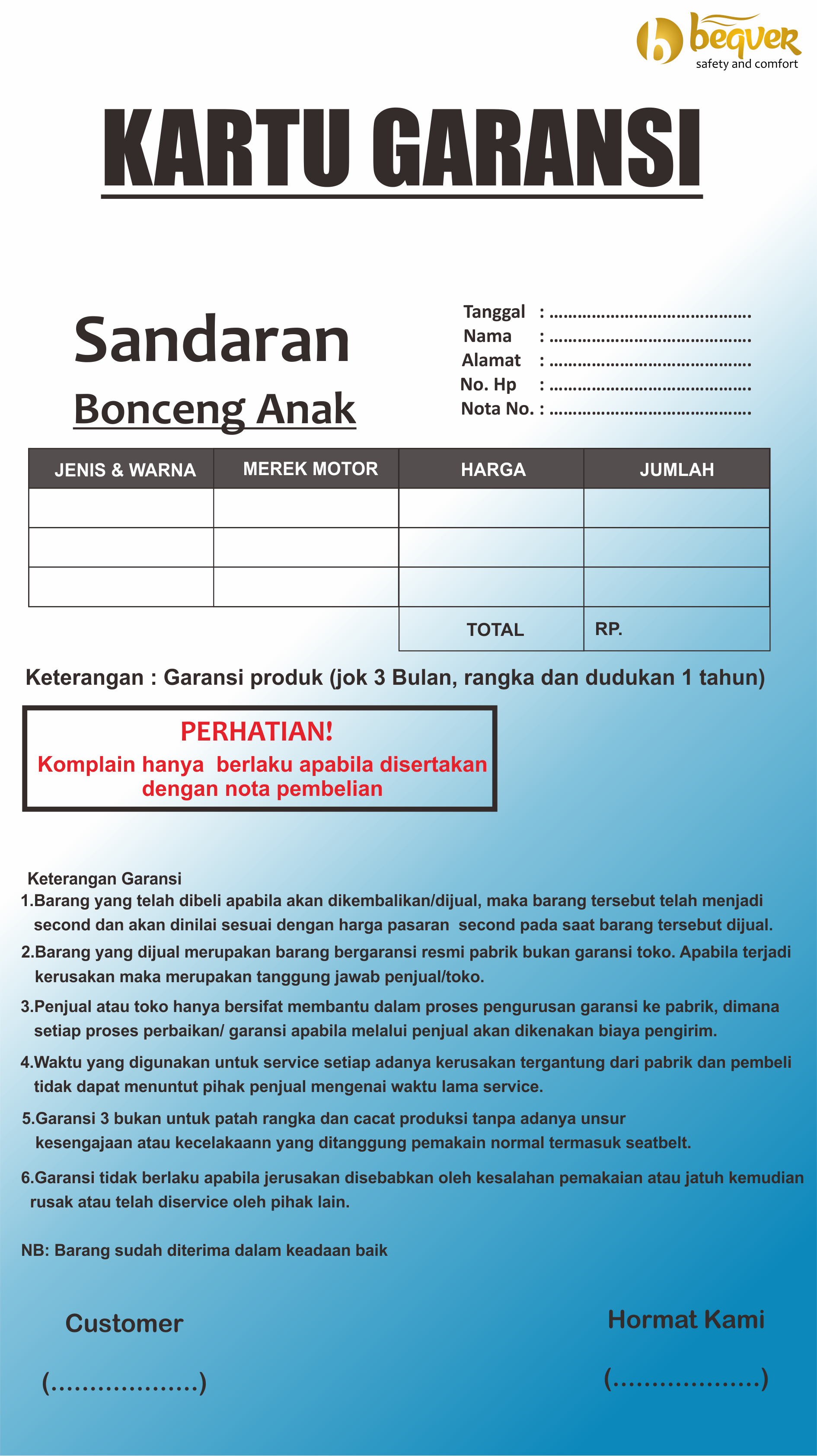 Sandaran Bonceng Anak menyediakan Garansi selama 3 bulan untuk cover boncnegan, dan 1 tahun untuk rangka